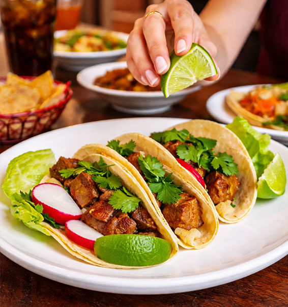 Handmade corn flour tortilla tacos with New York strips or chicken, pico de gallo and Salvadorean cheese